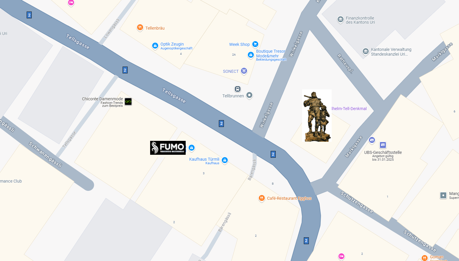 DIE FUMO TABACCHERIA MAZZUCCHELLI LIEGT IM ZENTRUM VON ALTDORF, GEGENÜBER DES WELTBEKANNTEN TELLDENKMALS.